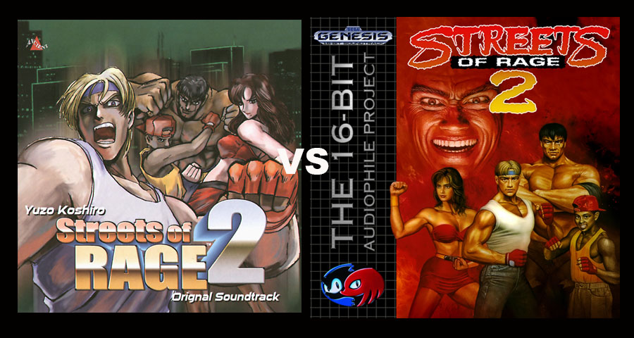 From the start, the Streets of Rage II soundtrack offers better stereo separation, with the Bare Knuckle soundtrack sounding more restrained. There is a restrained audio line in the track, which can be mistaken for a mixing error of bass over treble on the Streets of Rage II track, but this is inherent in the song and this restrained line is in all the versions of the song I have.
